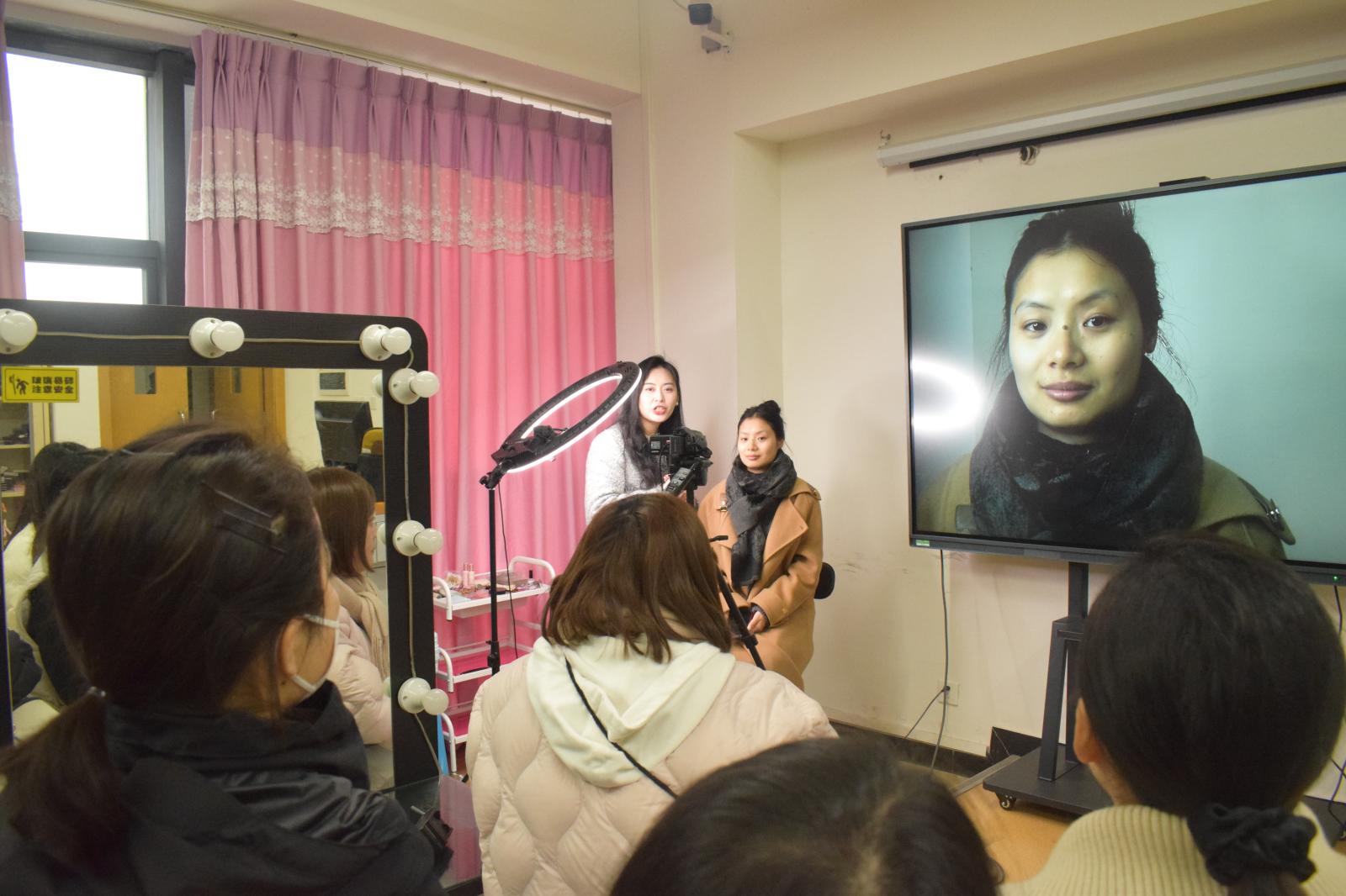 在生活日妆活动现场,医美专业的师生们成了温柔“魔法师”。她们手持眉笔、眼影刷,小心翼翼地为女老师们画眉、涂眼影、修容。女老师们惬意地闭眼,静静享受这难得的放松时刻。