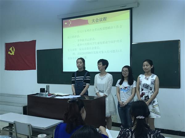 会上,全体党员同志一起学习了王东明书记在全省高校思想政治工作会议上的讲话,民主选举产生了护理系党支部第一届支部委员会委员,邹金梅、唐虹、兰瑚、何妙湄、郑笃永5名同志当选。