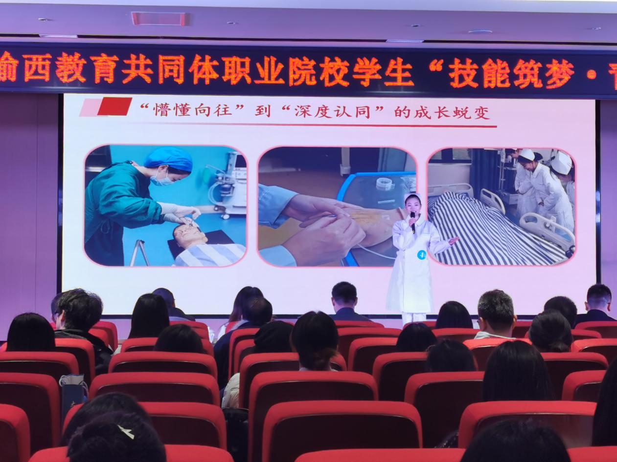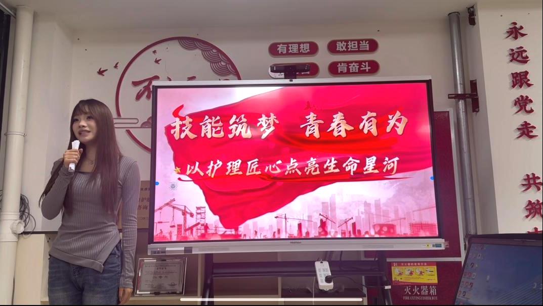 备赛期间,学院高度重视,组建指导团队,从演讲内容打磨、PPT背景制作,到表达技巧提升、仪表仪态塑造,为学生提供全方位悉心指导。周蕊以《技能筑梦,青春有为:以护理匠心点亮生命星河》为题,结合护理专业特色与自身实践,生动讲述了藏族实习护士跪地施救、北京积水潭医院护理团队等行业工匠的感人案例,分享了自己学习静脉穿刺、探索智能护理设备的成长历程,深刻诠释了新时代护理学子对“技能筑梦”的理解。演讲中,她语言流畅、情感饱满、台风稳健,既展现了护理专业严谨细致的职业素养,又彰显了青年奋发有为的精神风貌,赢得了现场阵阵掌声。