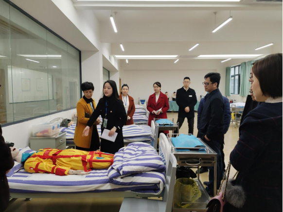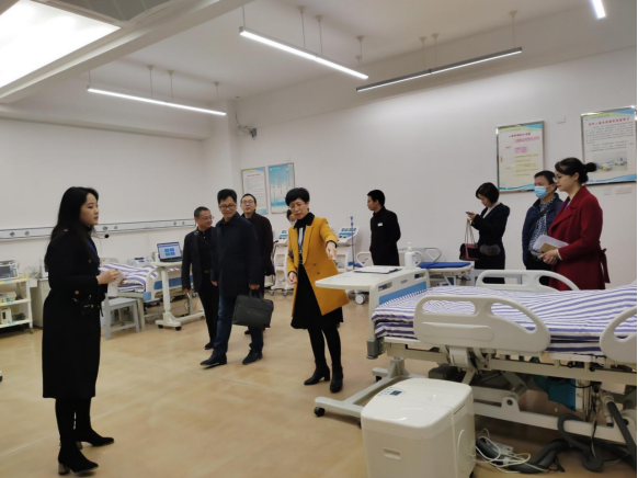 刘安勇科长一行先后参观了中医养生健康康复、老年人膳食保健、老年人健康评估、老年人能力评估、老年人生活照护、老年人基本救护6间实训室,深入了解了各实训室的规划布局,以及各老年专业特色设施设备的功能作用。对老年产教融合实训基地建设进展表示满意,对学院统筹科学规划、合理基地布局、规范开展建设予以肯定。并指出发展“产教结合、校企一体”的办学模式,有利于促进地方经济繁荣发展,有利于激发学生的创造力和创新力,有利于提高教师的业务水平,为自贡市的职业教育探索了新路径。