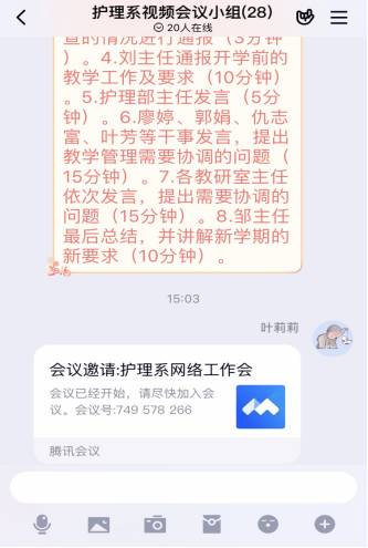 为了贯彻国家关于防控疫情的战略部署、“延期开学”“停课不停学”的工作要求,以及了解各教研室及教职工近期的工作开展情况及需要协调的问题。2月13日下午,护理系以网络视频的形式召开新学期第一次系部工作会议。会议由护理系主任邹金梅主持,护理系各教研室主任、系部干事以及两附院护理部主任廖常菊、聂臣聪等28人参加了会议。
