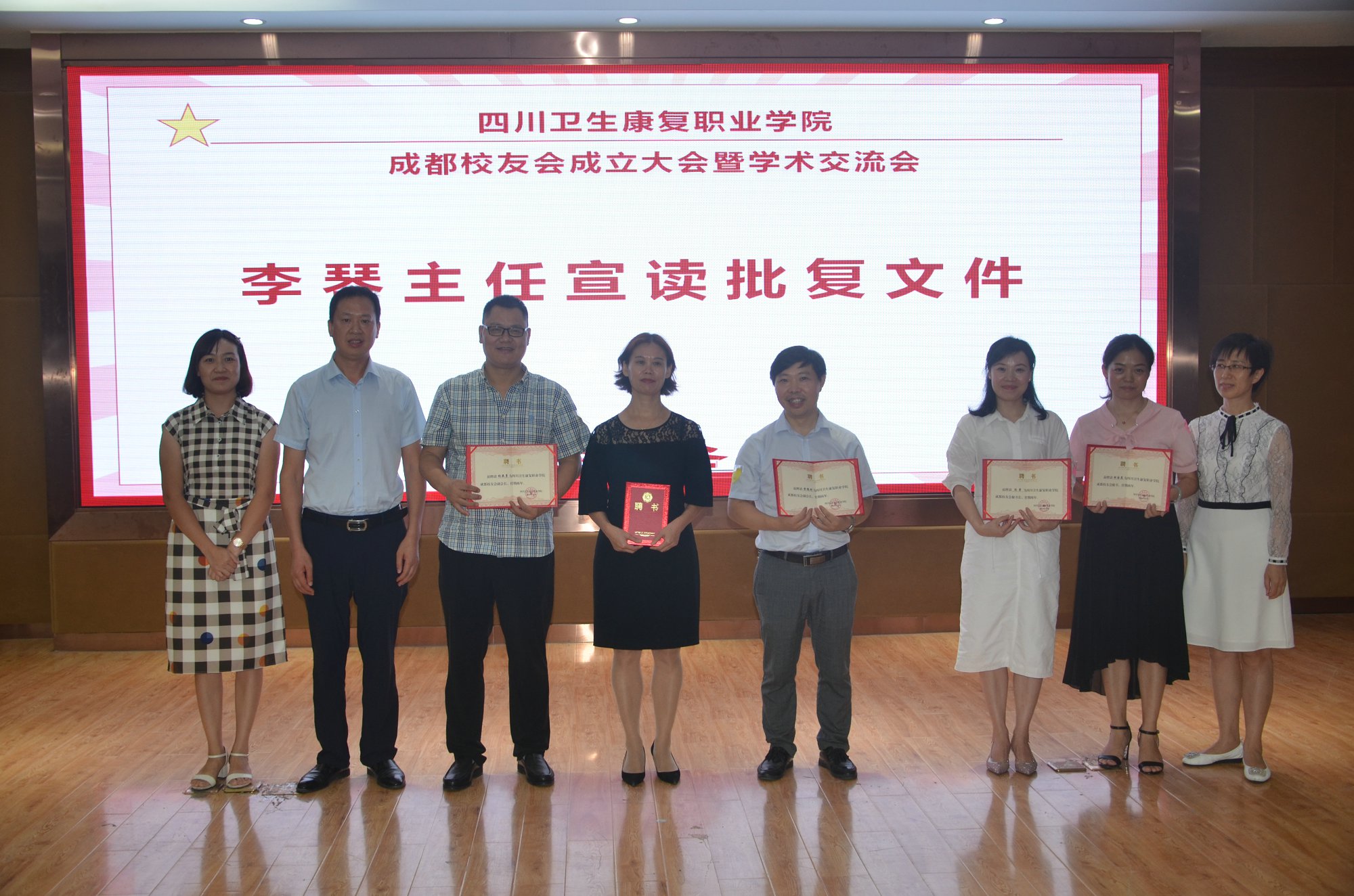 在成都校友会成立大会上,首先由李琴宣读《关于同意成立KY开元集团官网成都校友会的批复》,并向成都校友会会长李玉美,副会长杨照勇,黄德财,秘书长陈果,胡国英,颁发了聘书。