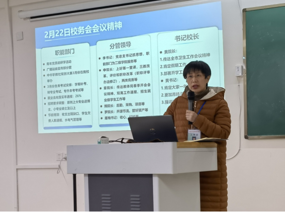 随后,护理学院院长邹金梅传达了校务会会议精神,通报总结了假期工作,并从开拓创新提升党建品牌,多措并举扩大社会影响,凝心聚力提升治理能力,自加压力提升团学水平,克难攻坚提升教研能力五个方面对本学期重点工作进行了安排部署,确保工作落实落细落到人,攻坚克难实现短板突破。