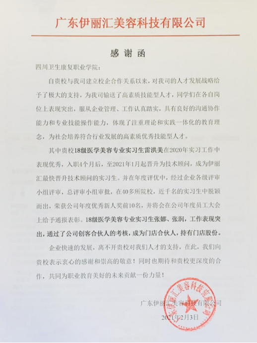 广东伊丽汇美容科技有限公司致函感谢开元官网为企业输送高素质技能型人才,并对开元官网学生实习表现给予了充分的肯定,也期望与开元官网继续加强合作,培育优质医美人才。