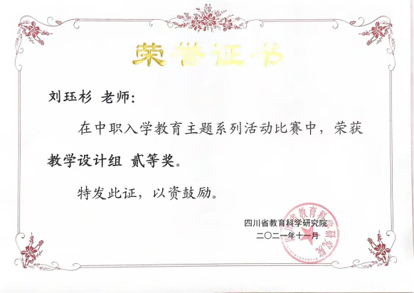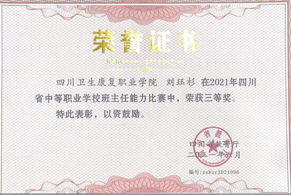 近日,由四川省教育厅举办的2021年四川省中等职业学校班主任能力比赛,及由四川省教育科学研究院举办的2021年四川省中职入学教育主题系列活动比赛结果出炉。代表学校参赛的护理学院辅导员刘珏杉在比赛中脱颖而出,两项省级比赛均有所获,在2021年四川省中等职业学校班主任能力比赛中喜获三等奖,另外其作品《们仁特之,爱我中华》在2021年四川省中职入学教育主题系列活动比赛中荣获教学设计组二等奖。护理学院将认真总结比赛经验,加强辅导员队伍建设,着力提高辅导员育人水平,进一步提升学生思想政治教育的有效性。