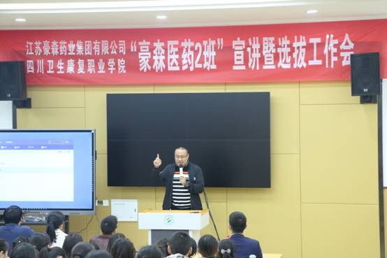 10月24日晚,学院与江苏豪森药业集团有限公司共同举办的“豪森医药2班”学员选拔工作会在1-B405召开。江苏豪森药业集团有限公司四川川东区域经理徐文斌、自贡办经理张桥、人力资源部范旭东以及药学系师生共计200余人参加会议。