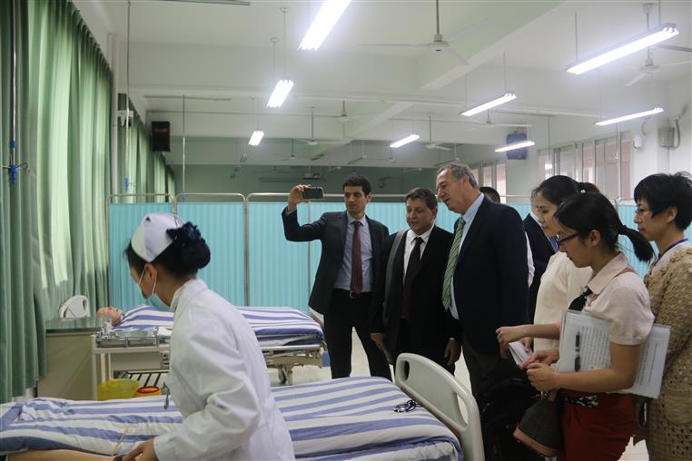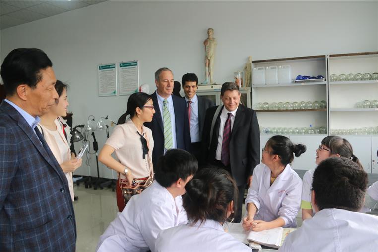 虞贵兴代表市卫计委向到访的以色列客人以及四川铁路产业投资集团公司一行表示了热烈的欢迎。曾晓奇向客人们介绍了学院和两个附属医院的相关情况。与会双方就国内康复高等教育、康复人才成长路径、康复专业发展等内容进行了交流。肖旭孟表示希望今后双方建立更深层次的友谊和合作。与会领导专家们还参观了学院解剖标本陈列室、护理、康复实训室等。