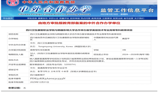 学校高度重视中外合作办学项目申报工作,积极与韩国东明大学就合作协议、培养方案、师资引进、教材选用等方面多次讨论,不断完善申报材料,顺利通过教育部审批。该项目纳入国家普通高等学校招生计划和四川省高等职业院校单独招生计划,学制3年,于2024年开始招生。招生对象为参加全国普通高等学校统一入学考试和四川省高等职业院校单独招生考试,并符合相关招生录取规定和要求的考生。