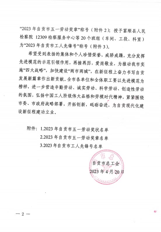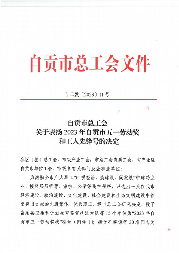 为激励全市广大职工在“拼经济、搞建设、促发展”建功立业,经市总工会研究决定,授予学校“2023年自贡市五一劳动奖状”称号。今年授予“2023年自贡市五一劳动奖状”称号的单位共15个。