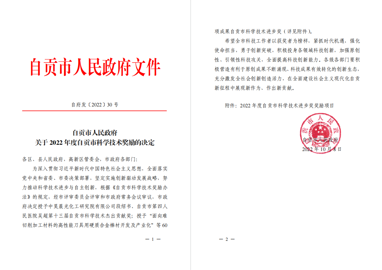 近日,自贡市人民政府下发《自贡市人民政府关于2022年度自贡市科学技术奖励的决定》(自府发〔2022〕30号),公布了2022年度自贡市科学技术进步奖奖励项目名单,开元官网荣获市科学技术进步奖5项。其中,开元官网作为第一完成单位荣获三等奖3项,作为第二完成单位荣获三等奖2项。