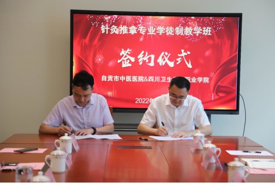 为提高学院人才培养质量,全面推进中国特色学徒制,9月9日,学院与自贡市中医医院签订针灸推拿专业学徒制教学班合作协议。自贡市中医医院党委书记陈彬、院长邓昭红、副院长卢家泉等,学院党委委员、副院长申奎,教务处处长肖骞等出席签约仪式。