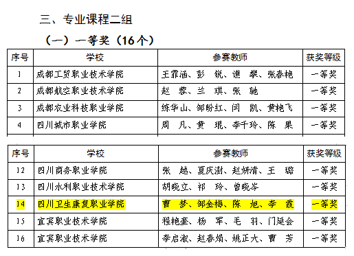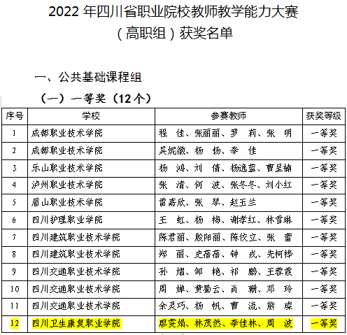 在2022年四川省职业院校教师教学能力大赛中,开元官网参赛的8支队伍全部获奖。其中高职组康复治疗专业群内公共基础课教师获“公共基础课程组”三项大奖:周波、李佳林、林茂然、廖文娟获一等奖,蒋晓娟、张茂、段晓芳、张莉获三等奖,洪晓静、杨怡、梁乔、李捷获三等奖;群内专业基础课教师陈帅、陈荣、何福超获“专业课程一组”三等奖;群内护理专业教师邹金梅、曹梦、李霞、陈旭获“专业课程二组”一等奖,群内康复治疗技术专业教师任凯、牟杨、袁燕琳、赵江获“专业课程二组”二等奖;群内护理专业教师王敏获中职组“专业技能课程二组”三等奖;药品食品学院教师郑茜、杨洋、梁菊俄获“专业课程一组”三等奖。这是学校在四川省教师教学能力比赛中首次突破一等奖奖项,学校获评“最佳进步奖(高职组)”奖项。