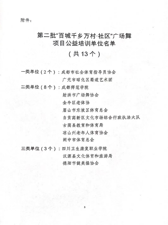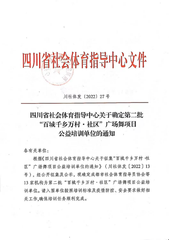 近日,四川省社会体育指导中心下发《四川省社会体育指导中心关于确定第二批“百城千乡万村·社区”广场舞项目公益培训单位的通知》,KY开元集团官网被评为第二批“百城千乡万村·社区”广场舞项目公益培训单位。