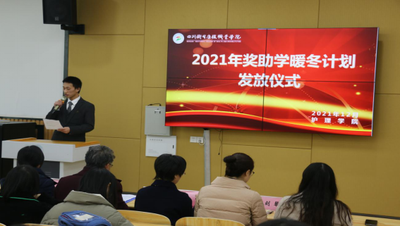 为了把党和国家对家庭经济困难学生的关怀落实落细,切实帮助家庭经济困难的同学温暖过冬、暖心学习,鼓励优秀的学生再接再厉,在学生工作部的统筹下各二级学院举行了2021年奖助学“暖冬计划”发放仪式。参加本次“暖冬计划”发放仪式的有学院领导、相关处室、二级学院教师代表和学生代表等。