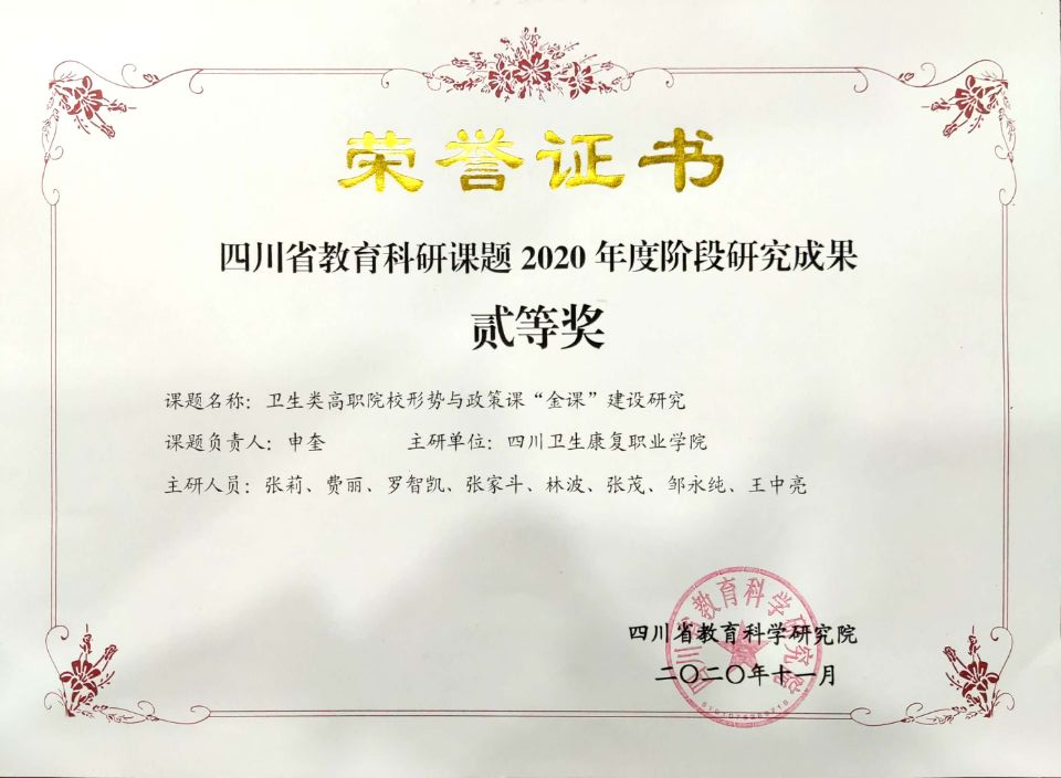近日,四川省教育科学研究院公布了四川省教育科研课题2020年度阶段成果获奖名单,开元官网申奎主持、思政部教师主研的《卫生类高职院校形势与政策课“金课”建设研究》课题在299项参评课题中脱颖而出,斩获二等奖。