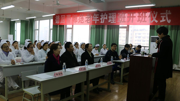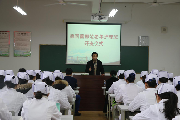 范少东说,这个班能够成立非常不易,我们先后酝酿洽谈了两年之久,今天终于迎来了老年护理班的开班,希望同学们珍惜机会,学好本领,不论是到德国还是留在中国,都能成为老年护理事业的有用人才。随后他介绍了德国的养老护理现状,增进了学生们对德国养老护理模式的初步认识。
