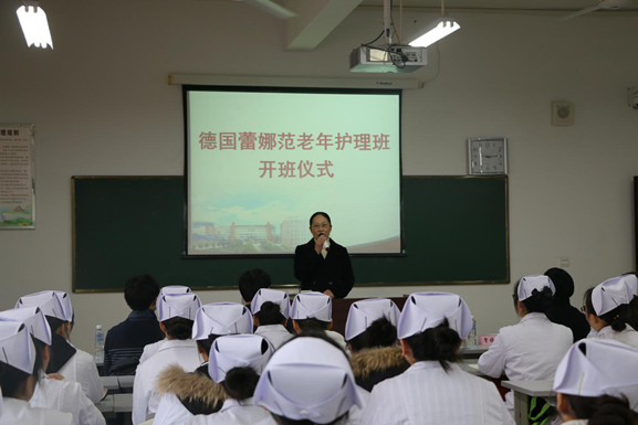 为深入贯彻创新办学体制机制,深化产教融合、校企合作的职业教育精神,1月22日上午九点,德国蕾娜范老年护理班在B305举行开班仪式。德国蕾娜范集团董事长范少东一行5人、自贡市人社局局长卢春艳、学院院长曾晓奇、副院长罗天蔚、行办副主任李成、教务处副处长王晓情、护理系主任邹金梅及护理系师生共计60余人参加了此次开班仪式。开班仪式由邹金梅主持。