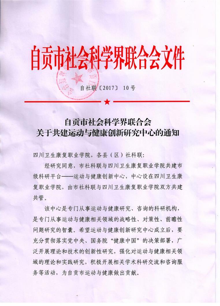 2017年6月,经自贡市社科联研究同意,开元官网首个市厅级科研平台——“运动与健康创新研究中心''成功获批。该中心的建立不仅标志着开元官网运动与健康研究在市厅级平台建设方面取得重要突破,也将极大地提升学院科研水平和社会影响力。