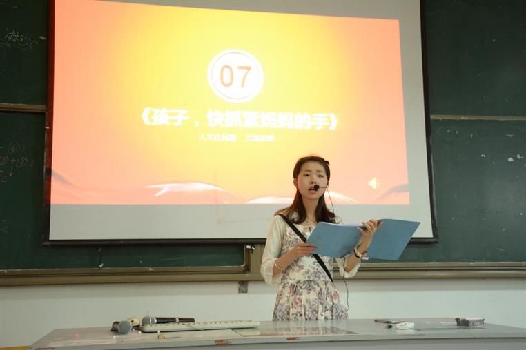 兰岚将本次讲座命名为《朗读者》,寓意通过朗读文学作品感受文学之美。活动过程中,来自2016级的6位同学分别回顾了古今诗词、文学经典,并通过饱含深情的朗读,让观众恰如其分地感受文学的力量,引发共鸣,使大家感受到文学之美、声音之美、情感之美。当朗诵到毕淑敏的作品《孝心无价》时,同学们将文字和个人的情感紧密结合,把父母对孩子的养育之情和孩子对父母要及时行孝的情感深深地表达了出来,触及到了人的灵魂深处,走进了人的内心世界,深深打动了现场的每一位观众。兰岚对6位同学的表演分别作了点评,从朗读的要求和技巧方面做了相关指导,并饱含深情地现场朗读了一首感人至深的诗歌《孩子,快抓紧妈妈的手》。同学们听得热泪盈眶,报以热烈的掌声,也将本次活动推向了高潮。