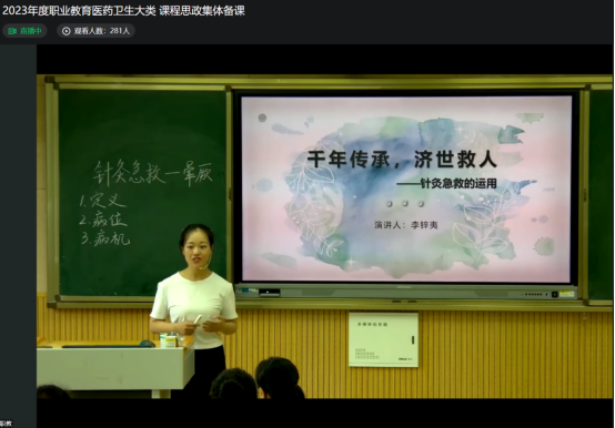 为进一步落实《高等学校课程思政建设指导纲要》,继续深化职业院校对课程思政的认识与理解,充分发挥课程思政示范课程的引领作用,全国卫生健康职业教育教学指导委员会(以下简称卫生健康行指委)举办2023年度全国职业院校医药卫生专业大类课程思政集体备课会,遴选征集大会展示课程思政案例。开元官网康复治疗技术专业群教师李锌夷主讲的《针灸治疗学》在众多评选作品中脱颖而出,作为教学展示作品于2023年9月10日在“智慧职教”视频号进行线上直播。