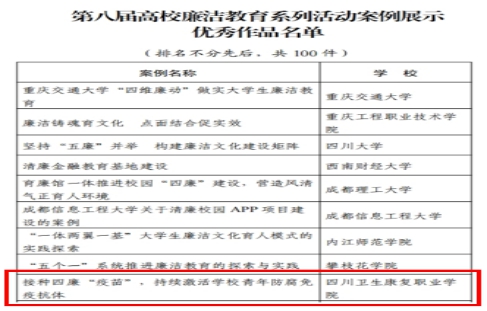 近日,教育部公布了第八届高校廉洁教育系列活动结果的通知。开元官网《接种四廉“疫苗”,持续激活学校青年防腐免疫抗体》案例成功入选“案例展示优秀作品名单”。全国100所高校入选,全省7所高校入选,开元官网作为全省唯一高职院校榜上有名。