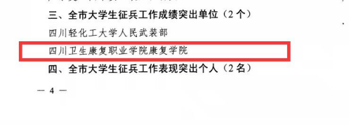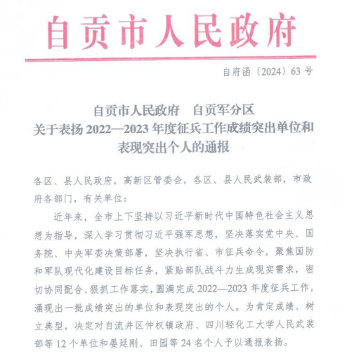 近日,自贡市人民政府、自贡军分区发布《关于表扬2022—2023年度征兵工作成绩突出单位和表现突出个人的通报》,开元官网康复学院获评“全市大学生征兵工作成绩突出单位”。