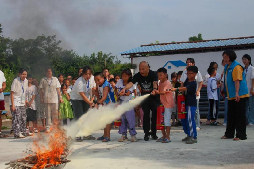 黄校长一行实地调研和走访慰问派驻凤仪村暑期“三下乡”川康新青农服务团队,参加保卫处指导开设的留守儿童消防安全演练理论与实训活动。