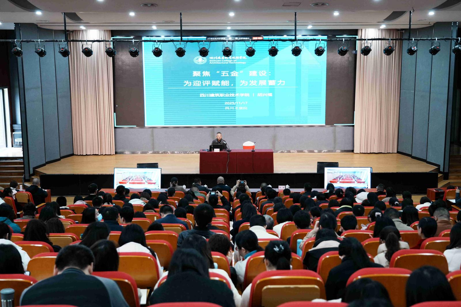 为深入贯彻落实《四川省高等职业学校办学能力评价实施方案(2025—2030年)》要求,精准把握办学能力评价核心要义与实施路径,全面夯实学校迎评工作基础,11月17日下午,学校特邀专家四川建筑职业技术学院原院长胡兴福教授到校开展高等职业学校办学能力评价专题培训暨专题研讨。在家班子成员、全校教职工参会,会议由党委副书记文铭生主持。