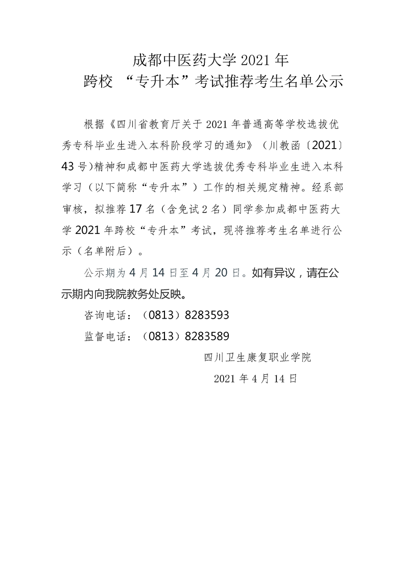 下一条:成都医学院2021年 跨校 “专升本”考试推荐考生名单公示