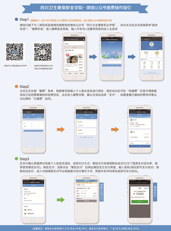 2.银行代扣:各位同学可以在当地任意银行网点将学费、住宿费及书费存入由学校统一发放的农行卡中(存款时请多存10元以方便学费缴纳),学校将于8月20日起委托银行统一代扣。