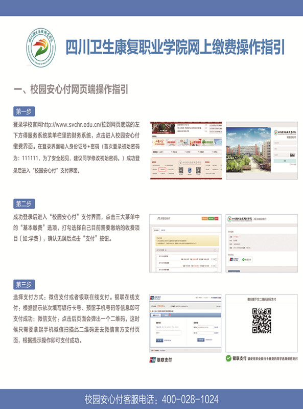 1.线上缴费:各位同学可以通过登录学校官网、关注学校官方微信平台、下载“校园安心付”APP等三种方式进行线上缴费(操作流程指引见附件)。