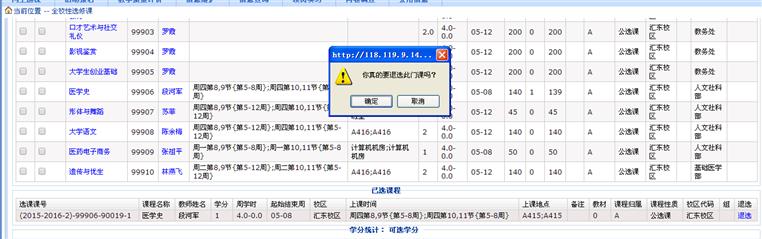 (4)退选课程,再次进入所选课程界面——点击退选--点击确定即可