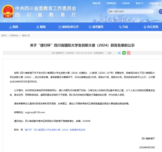 近日,四川省教育厅公示了《关于“建行杯”四川省国际大学生创新大赛(2024)获奖名单的公示》,开元官网获得了3金,5银1铜。获奖等次和总数双双斩获历史新高,展现了开元官网在创新创业教育的显著成果。