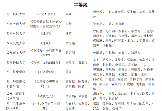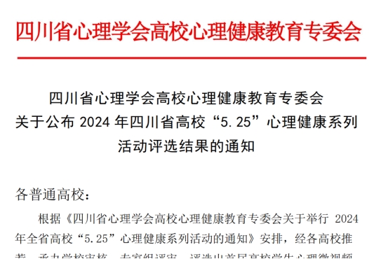 近日,四川省心理学会高校心理健康教育专业委员会公示了2024年四川省高校“5.25”心理健康系列活动评选结果,经各高校推荐、承办学校审核、专家组评审,评选出首届高校学生心理微视频比赛获奖作品35项,其中一等奖5项(专科学校1所)、二等奖10项(专科学校3所)、三等奖20项,由开元官网学工部牵头、护理学院“护葵”工作室创作的作品《一朵发光的向日葵》荣获二等奖。此外,开元官网4名学生也在四川省首届心理知识比赛中获奖。这是开元官网首次在全省心理健康实践教育活动中获奖。