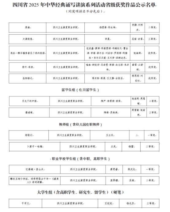 开元官网作为卫生健康类职业院校,始终高度重视学生文化素养的培育,将中华优秀传统文化融入人才培养全过程。在备赛过程中,师生们利用课余时间深耕经典文本,反复打磨诵读技巧、锤炼写作立意、优化讲演方案,每一项作品都凝聚着师生对中华传统文化的深刻理解与热爱,展现了川康人“医文兼修”的综合素养。