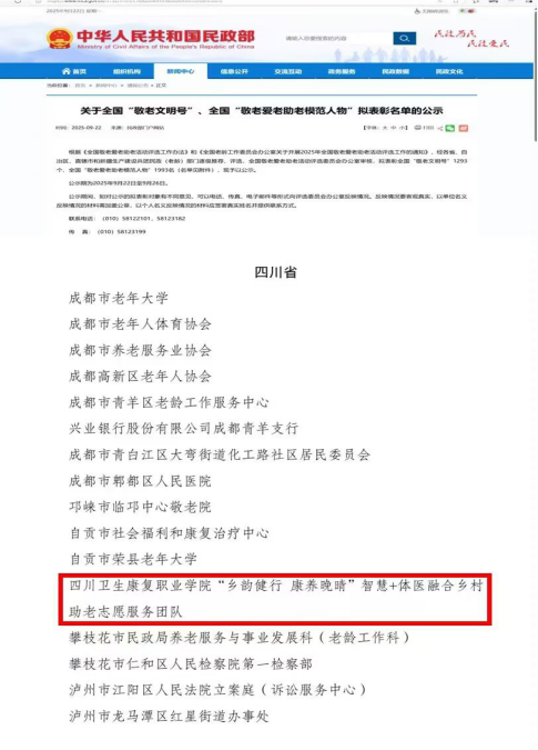 10月29日,全国老龄工作委员会办公室正式公布全国“敬老文明号”和全国“敬老爱老助老模范人物”表彰名单,开元官网护理学院“乡韵健行 康养晚晴”智慧+体医融合乡村助老志愿服务团队凭借扎实的服务成效、创新的志愿服务模式,被授予全国“敬老文明号”称号。