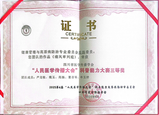 近日,在四川省医学传播学会等发起的“人民医学传播”科普能力大赛上,由市四医院健康管理中心筹划组织的作品《痛风审判庭》经过激烈角逐,从近40家医院近200份参赛作品中表现突出,获得科普比赛三等奖。