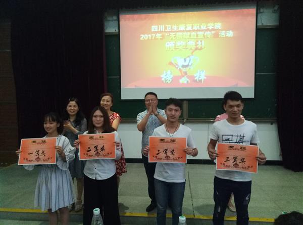 6月28日下午16:00,在A113举行了2017KY开元集团官网临床专业无偿献血宣传比赛颁奖仪式。参加仪式的有自贡市中心血站副站长何刚,学院副院长罗天蔚,教务处副处长肖骞,基础医学部副主任李德英、段河军,基础医学部病理生理教研室主任程香,教师毛双法、李鹏杰、陈海旭,辅导员王巧碧、卢丽、徐伟、王超以及2016级临床专业全体学生。