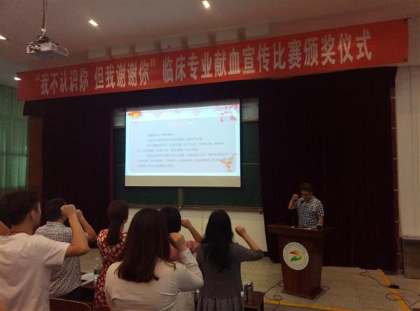 罗天蔚发表讲话,并宣布获奖名单。她指出,举办此次比赛是为响应国家“健康中国”的号召,提升国民健康意识,加强全社会对无偿献血的认识和支持。她本人也进行了三次献血,会继续以实际行动支持。为表彰先进,鼓舞士气,按照比赛方案评选出了无偿献血宣传先进集体4个:一等奖临床2班;二等奖临床4班;三等奖临床3班、临床1班。无偿献血宣传先进个人34人。罗天蔚与其余各领导为同学们颁奖,并与他们合影留念。