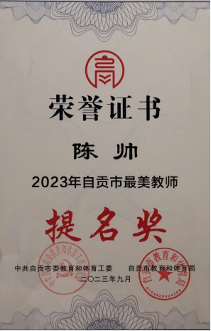 9月7日晚,在第39个教师节到来之际,自贡市教育体育局在四川轻化工大学盐都大剧院举行“躬耕教坛 强国有我 2023年自贡市最美教师颁奖典礼”,对2023年自贡市最美教师进行现场颁奖,KY开元集团官网基础医学院教学科科长、解剖学教师陈帅获得自贡市最美教师提名奖,展现了学院广大教师的精神风貌,在学院双高建设中发挥了积极作用。