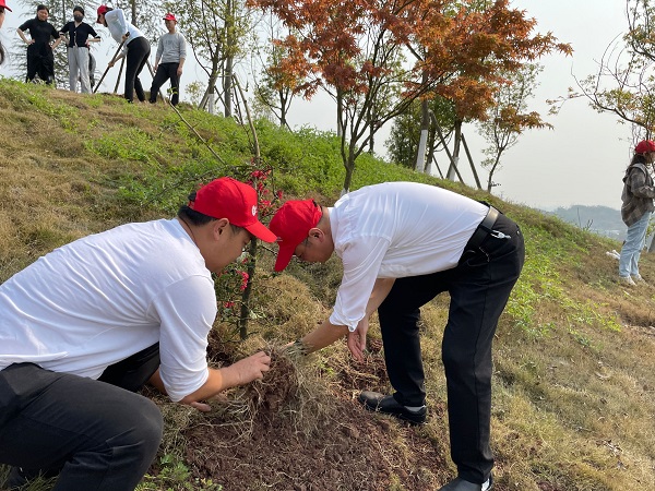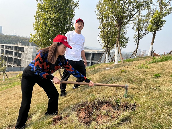 挖坑、埋苗、盖土、浇水……一系列操作下来大家都累得气喘吁吁。最终在大家通力配合下,基础医学部党支部成功栽植并认领了紫玉兰、日本红枫等4棵树。