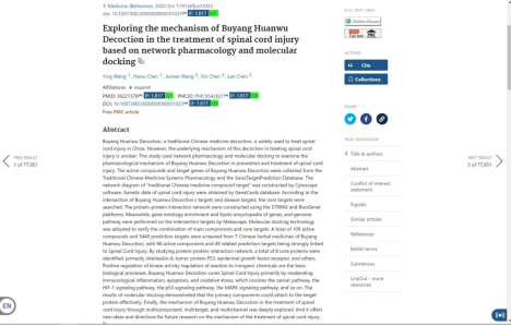 基础医学院王莹老师撰写发表论文《Exploring the mechanism of Buyang Huanwu Decoction in the treatment of spinal cord injury based on network pharmacology and molecular docking》,发表于SCI外文期刊Medicine (Baltimore),JCR3区 中科院4区。
