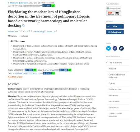 基础医学院陈海旭老师撰写发表论文《Elucidating the mechanism of Hongjinshen decoction in the treatment of pulmonary fibrosis based on network pharmacology and molecular docking》,发表于SCI外文期刊Medicine (Baltimore),JCR3区 中科院4区。