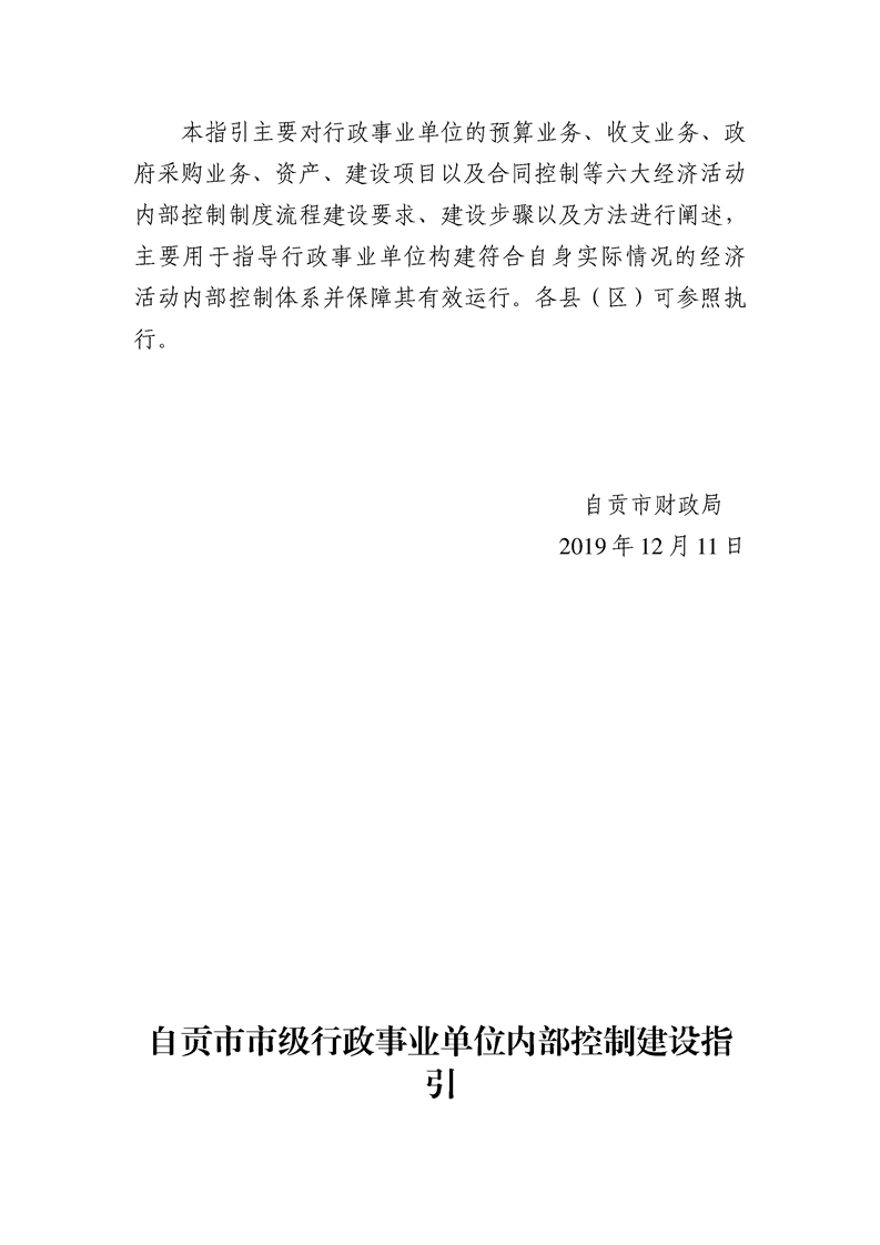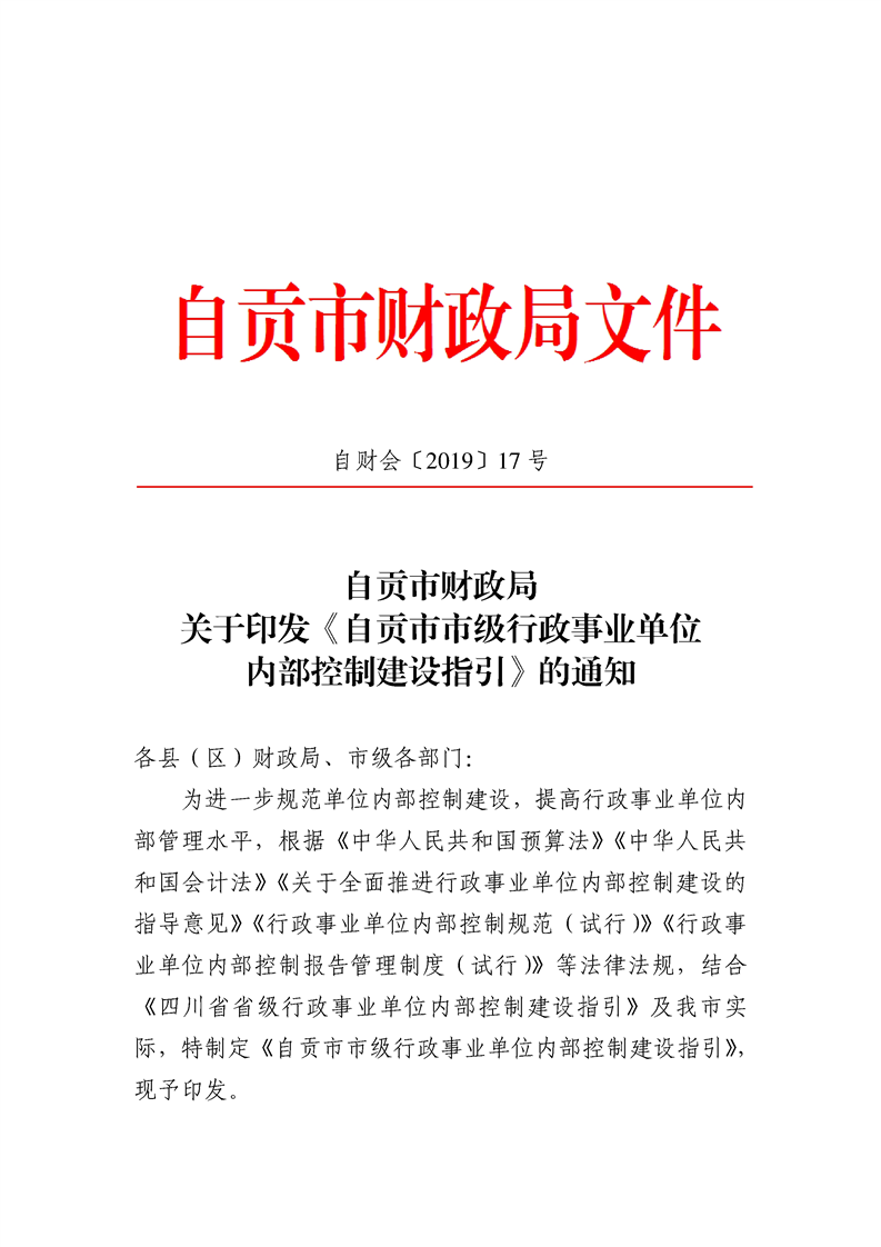 自贡市财政局关于印发《自贡市市级行政事业单位内部控制建设指引》的通知(自财会〔2019〕17 号)