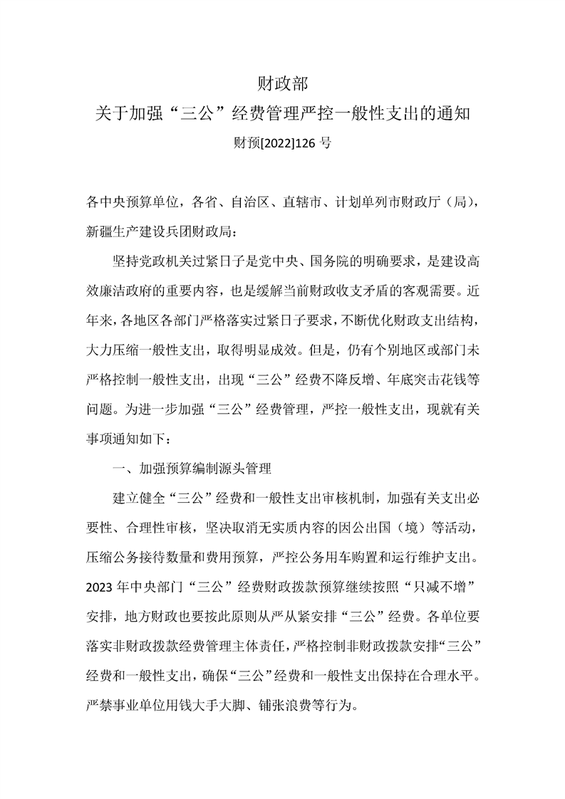 财政部关于加强“三公”经费管理严控一般性支出的通知 财预[2022]126号
