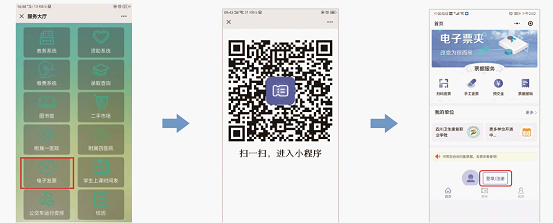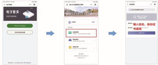 Step2.选择“微信用户快速登录”,点击“自助取票”,输入缴费学生姓名及身份证号后,查看电子票。