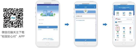 手机APP缴费:手机直接下载“校园安心付”APP,用“手机号码”注册登录,并用“身份证+姓名”绑定学生信息,点击缴费。