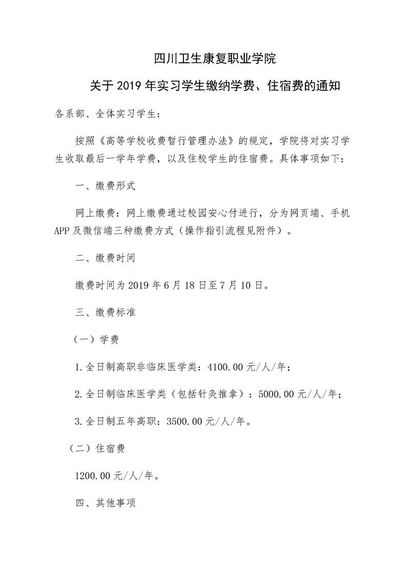 学院关于2019年实习学生缴纳学费、住宿费的通知