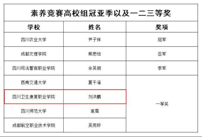 9月28-29日,由四川省教育厅主办的第九届全省学生“学宪法 讲宪法”决赛在四川农业大学举行。2023级护理5班刘洪麟同学在罗娅老师的指导下斩获素养竞赛高校组一等奖,并认定为四川省职业院校技能大赛项目二等奖。