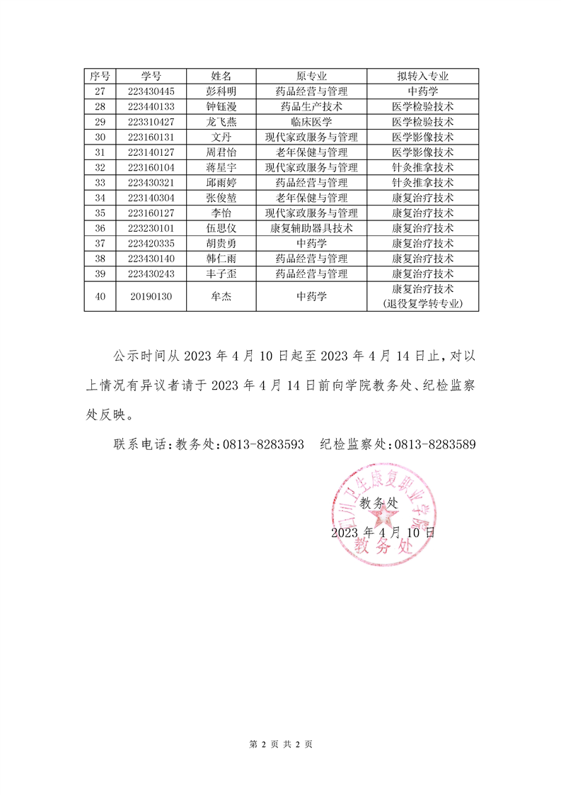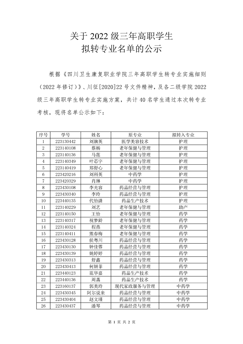 关于2022级三年高职学生拟转专业名单的公示
